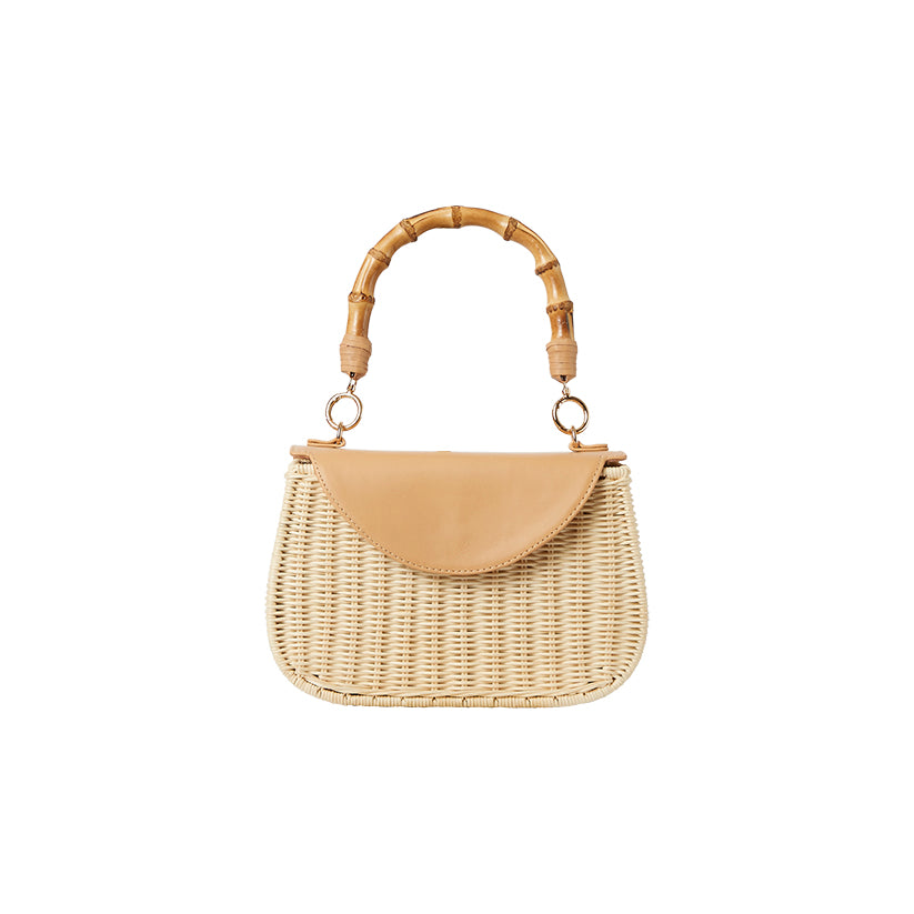 The Amy Wicker Bag is a structured wicker handbag with a soft cotton lining, interior pocket, and secure magnetic closure. A mix of natural textures and thoughtful design, it’s finished with lambskin and bamboo details for a refined, beach-to-city look.