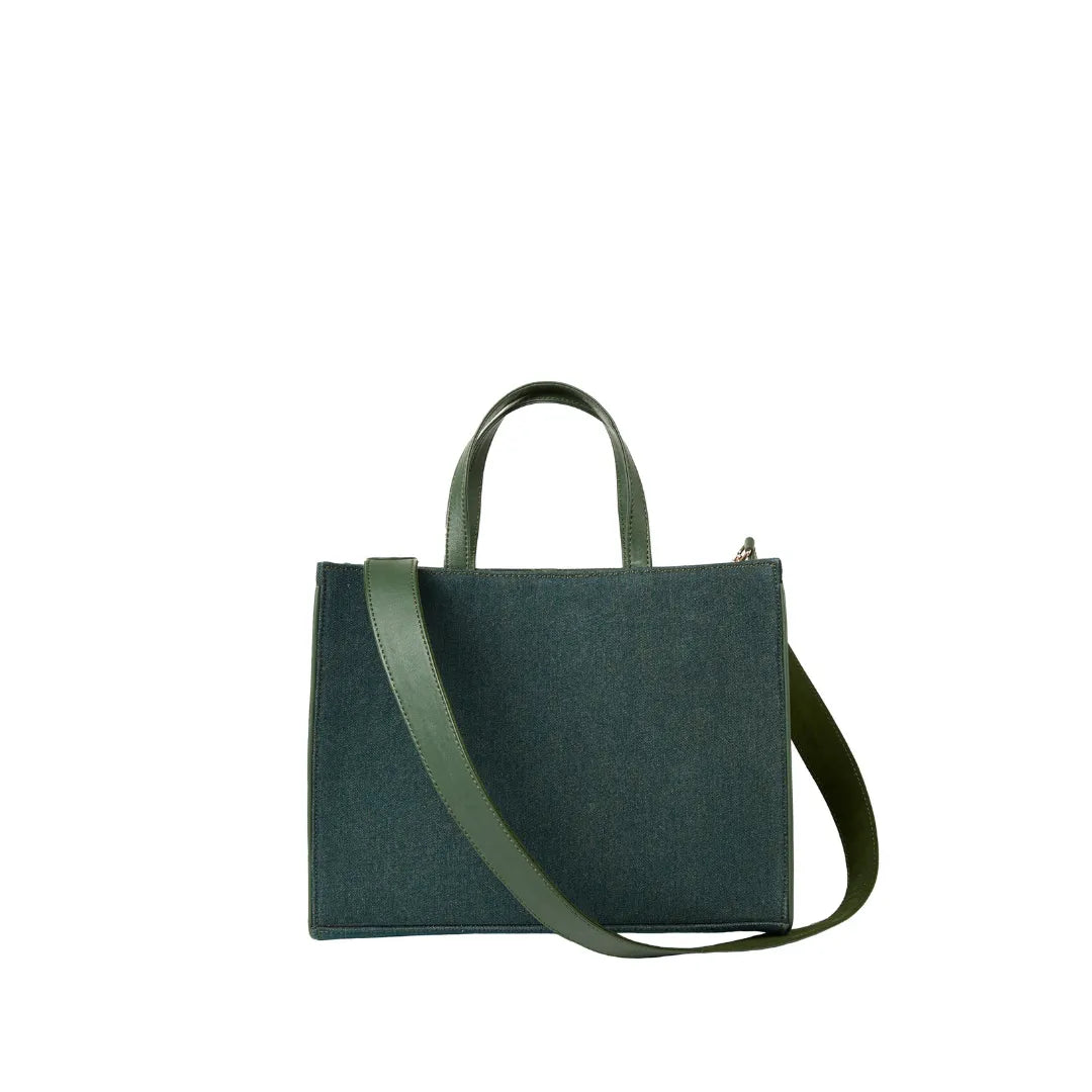 The Bernard Denim Tote is the perfect carryall. This trendy tote is made from hand-woven denim with a clip closure, a crossbody strap, and an interior pocket.