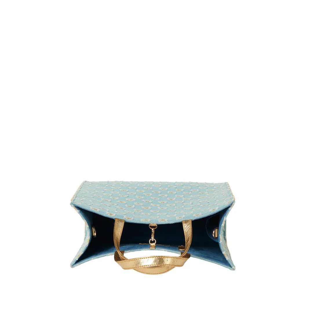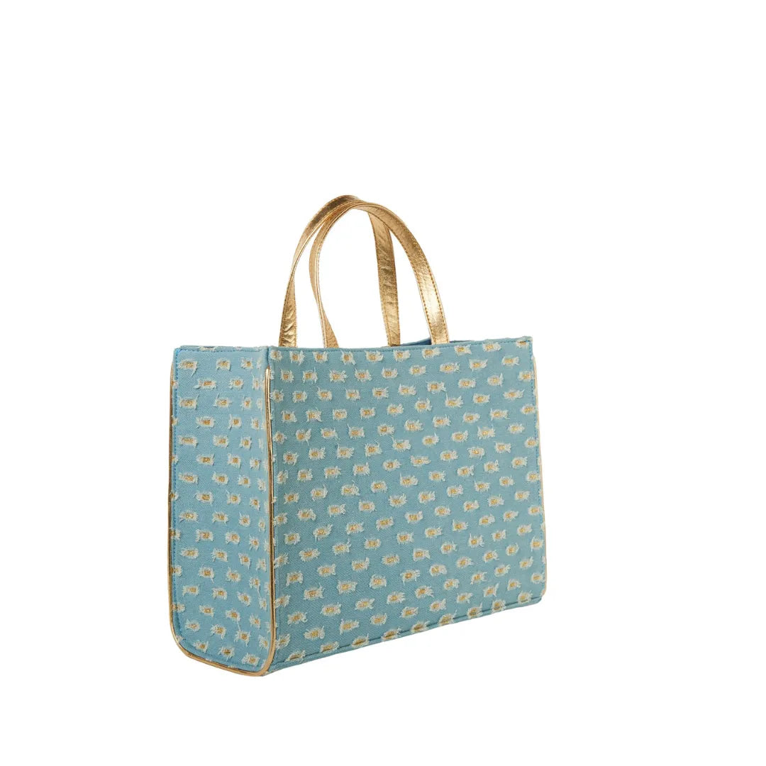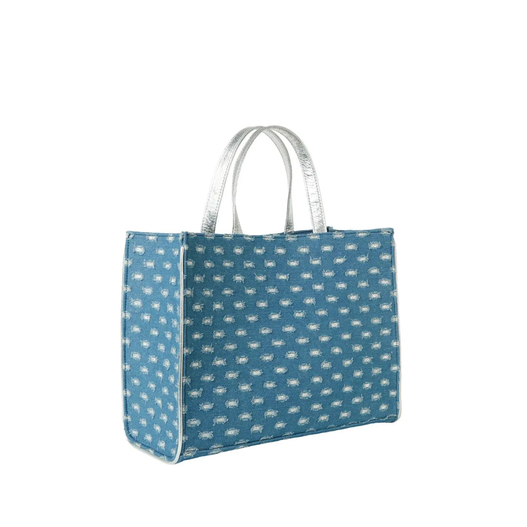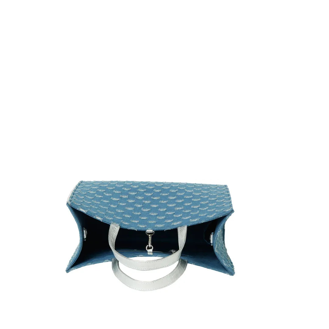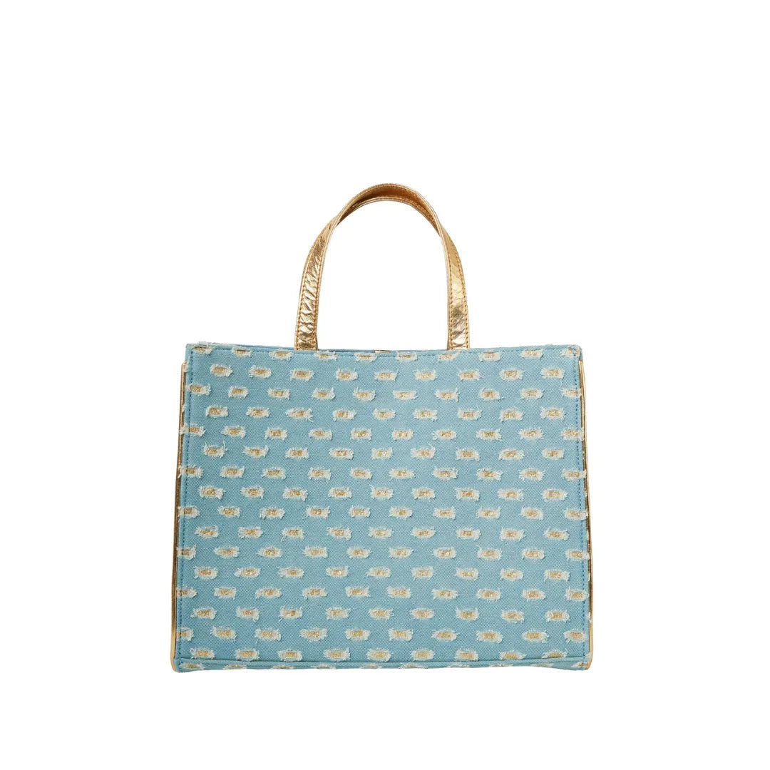 The Delilah Catch All is the perfect casual tote. This stylish tote is made from woven denim with lambskin piping, a crossbody strap, and an interior pocket.