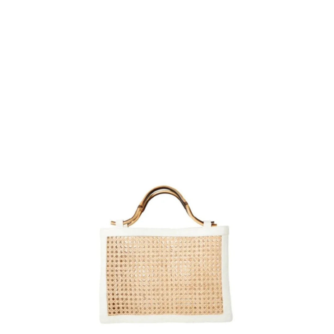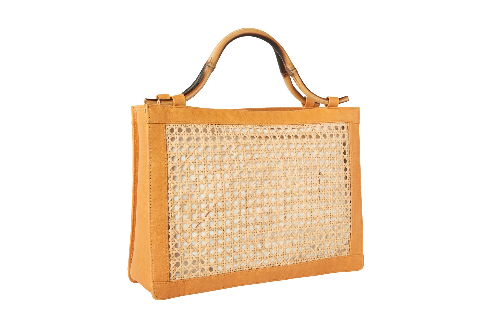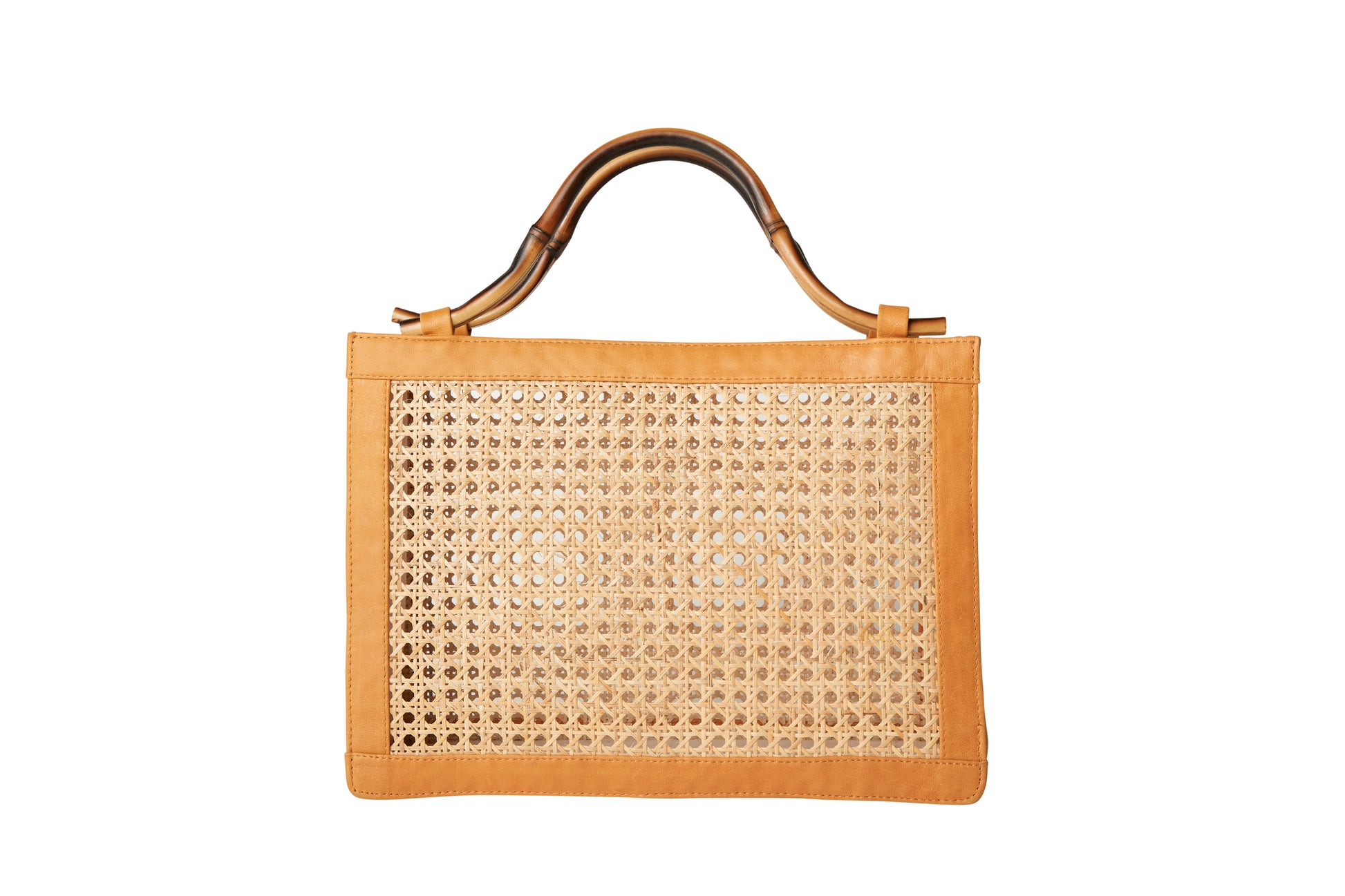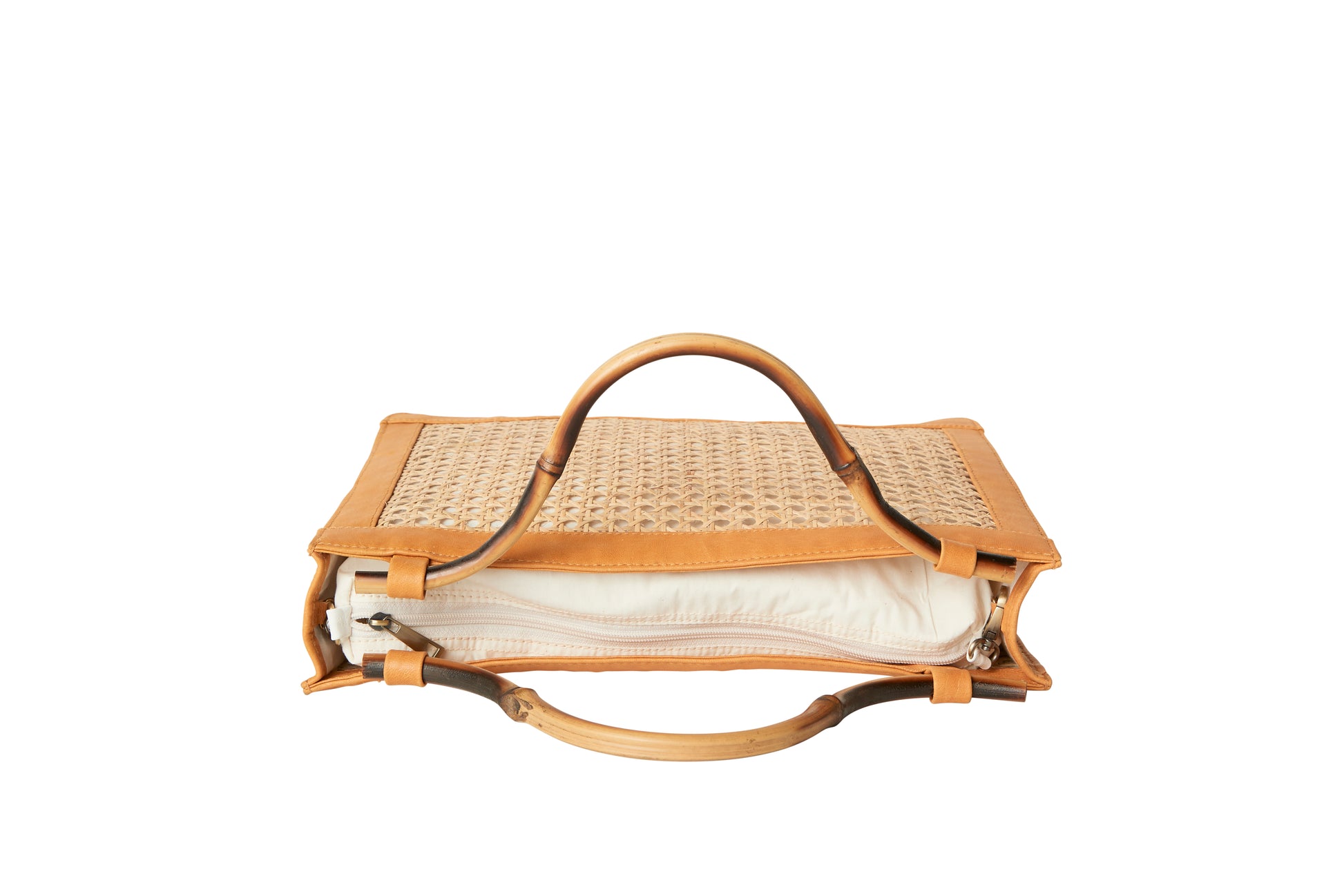 The Reece is a structured handbag crafted from natural wicker with a bamboo handle, removable cotton lining, and secure zipper closure. Finished with lambskin leather details, it blends classic materials with modern function.