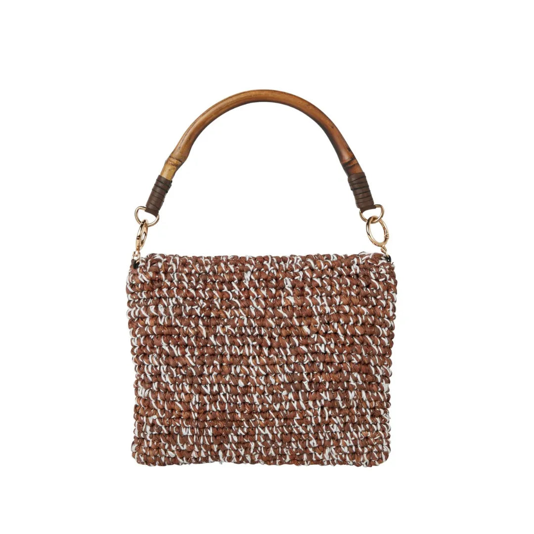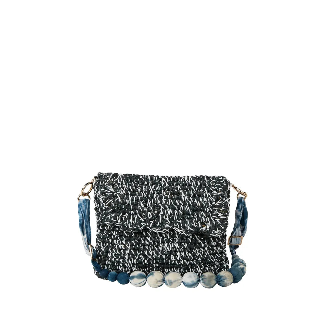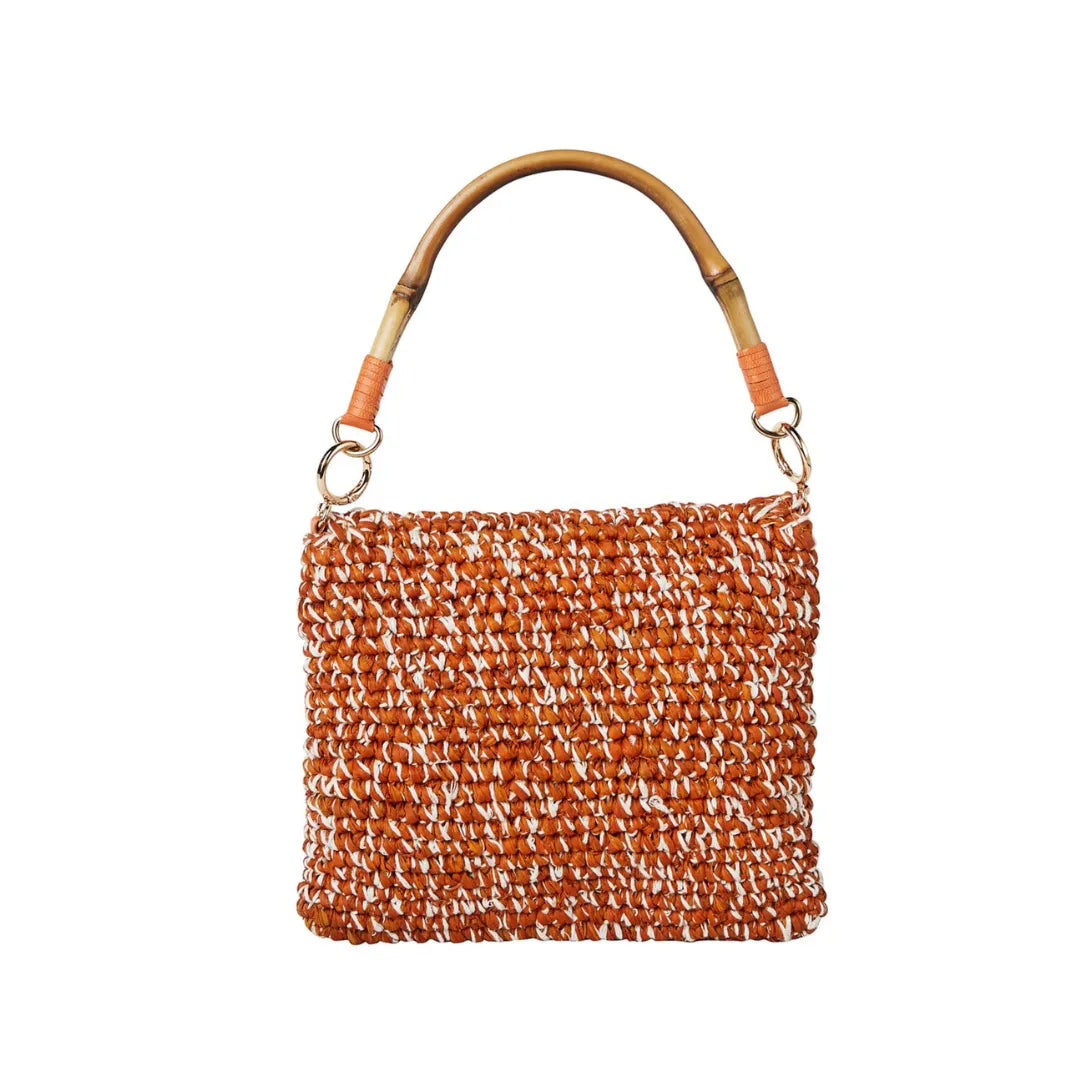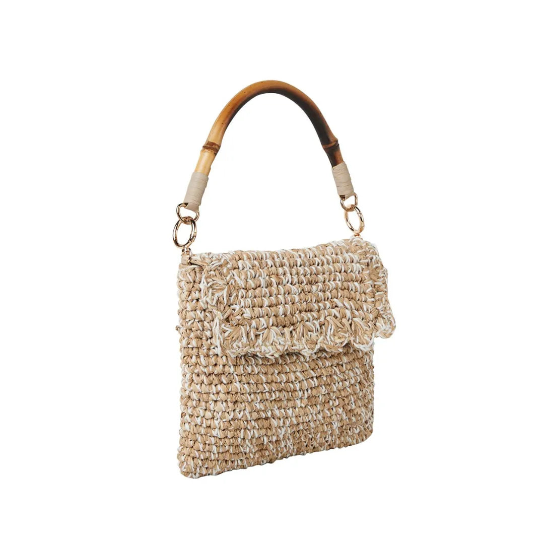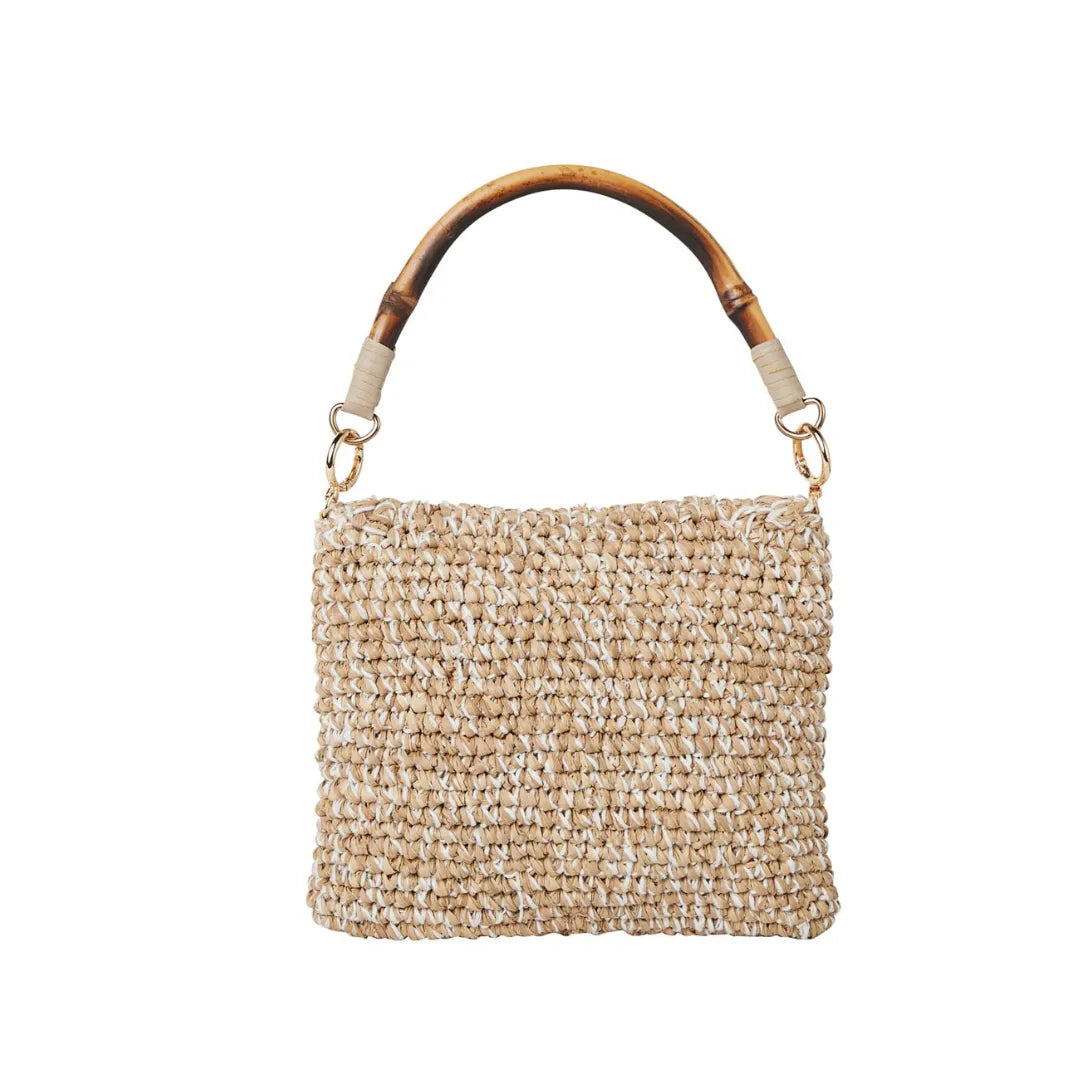 Features: Raffia shoulder bag with inside pocket and 2 interchangeable handles: a bamboo handle & block-printed beaded strap.