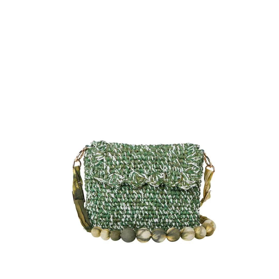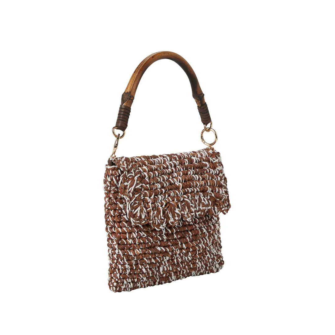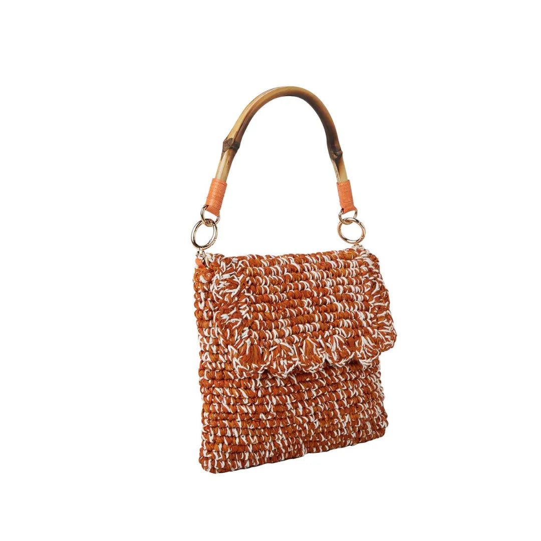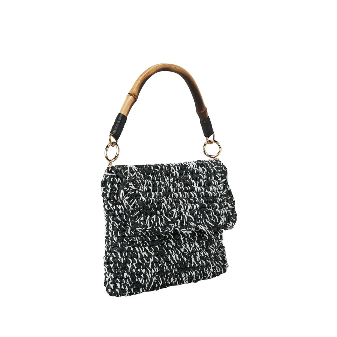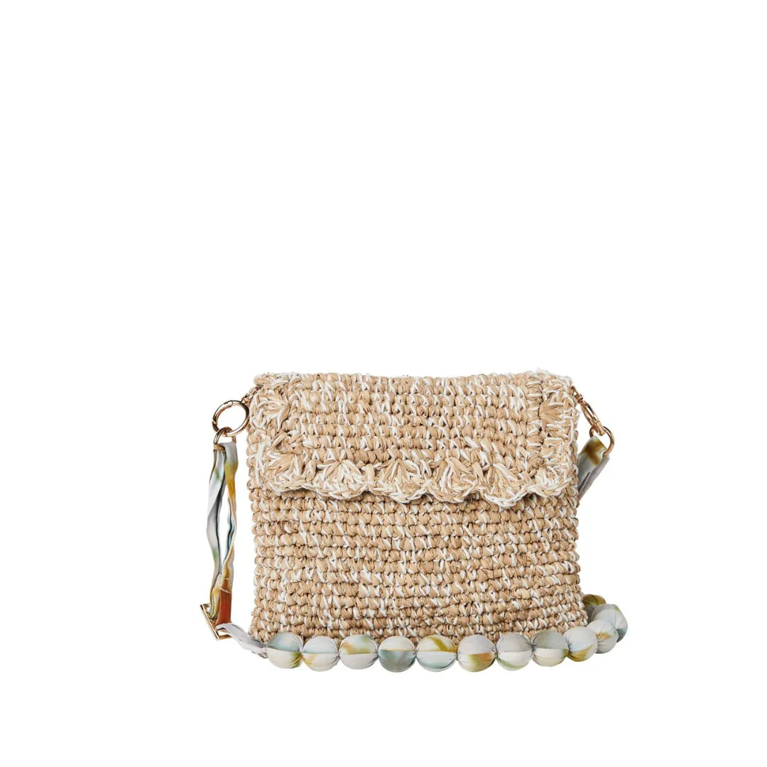 Features: Raffia shoulder bag with inside pocket and 2 interchangeable handles: a bamboo handle & block-printed beaded strap.