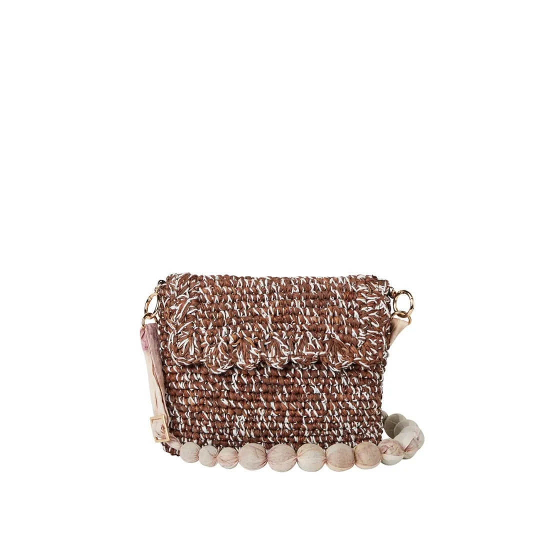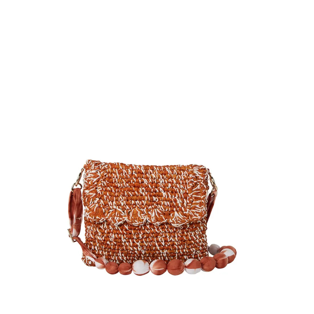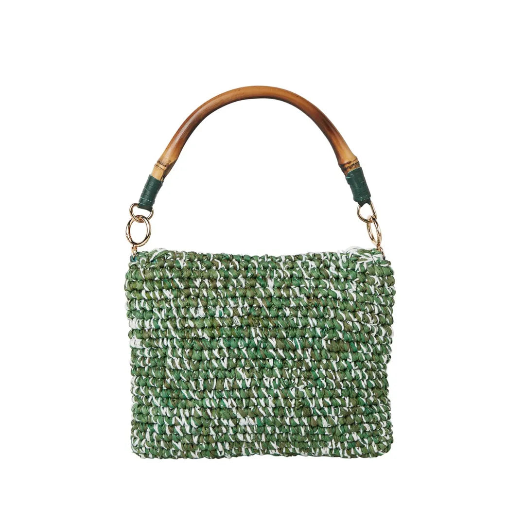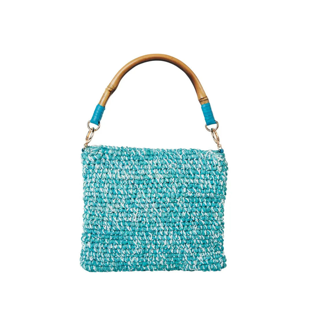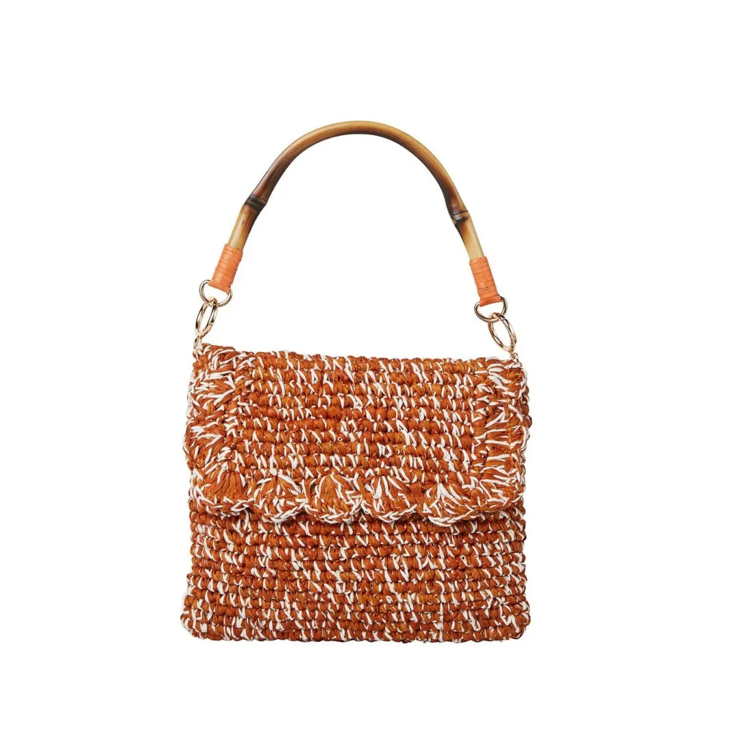 Features: Raffia shoulder bag with inside pocket and 2 interchangeable handles: a bamboo handle & block-printed beaded strap.