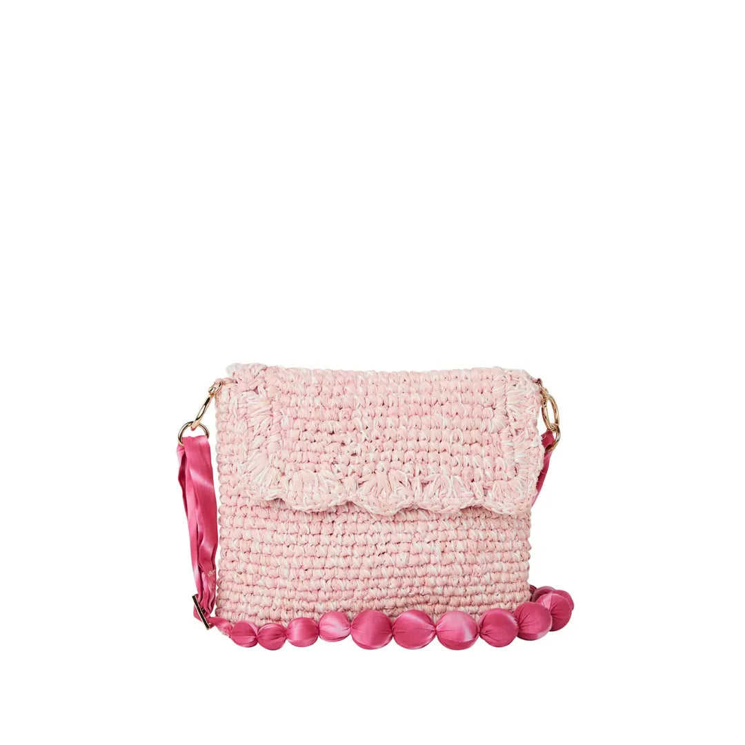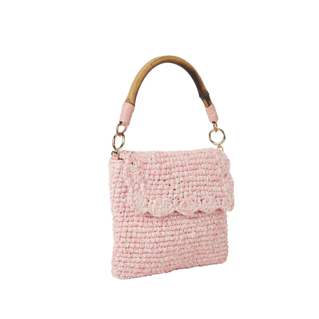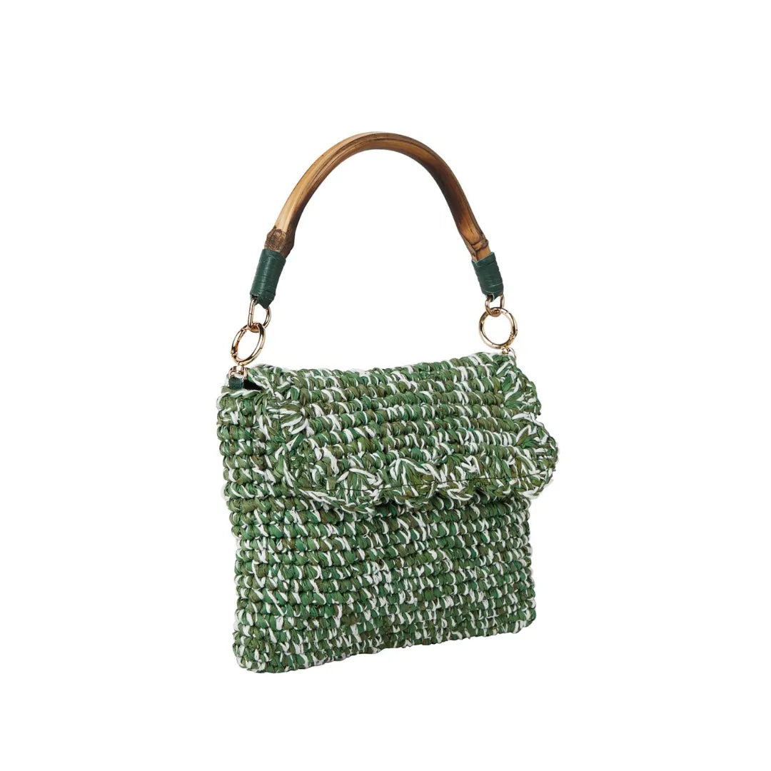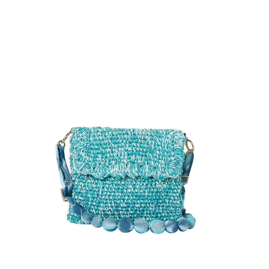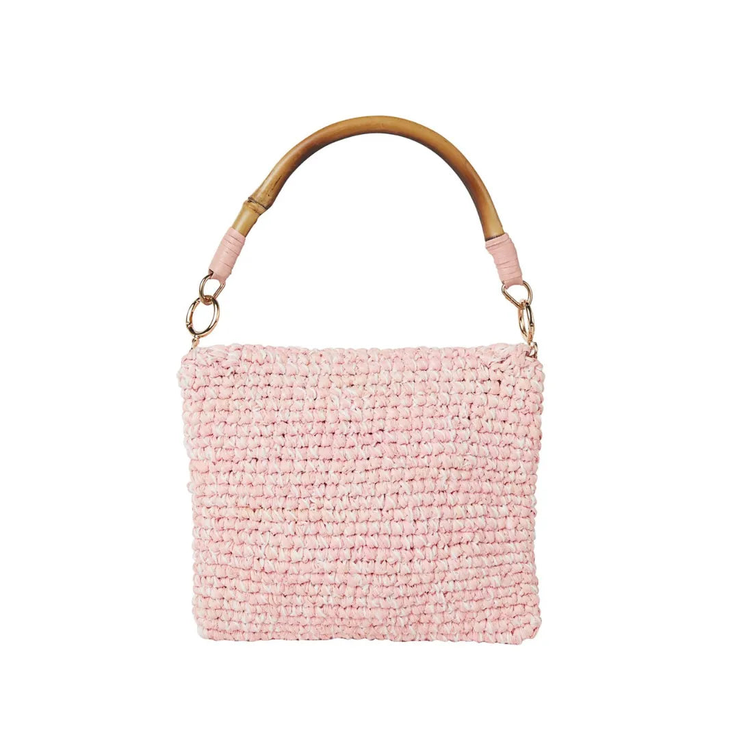 Features: Raffia shoulder bag with inside pocket and 2 interchangeable handles: a bamboo handle & block-printed beaded strap.