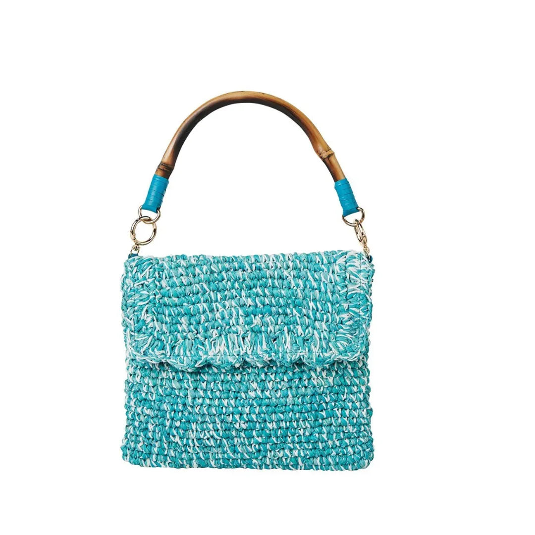 Features: Raffia shoulder bag with inside pocket and 2 interchangeable handles: a bamboo handle & block-printed beaded strap.