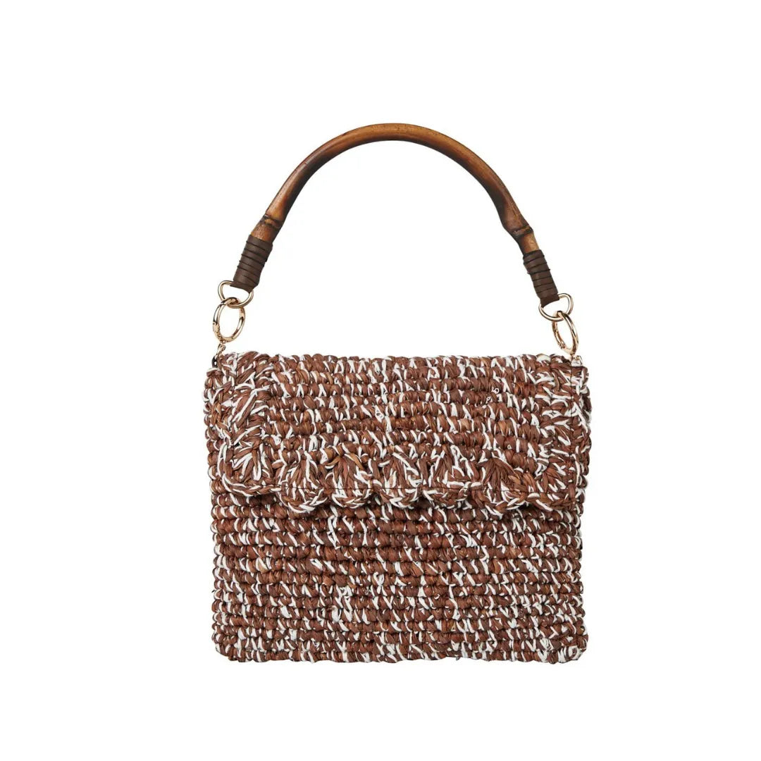Features: Raffia shoulder bag with inside pocket and 2 interchangeable handles: a bamboo handle & block-printed beaded strap.