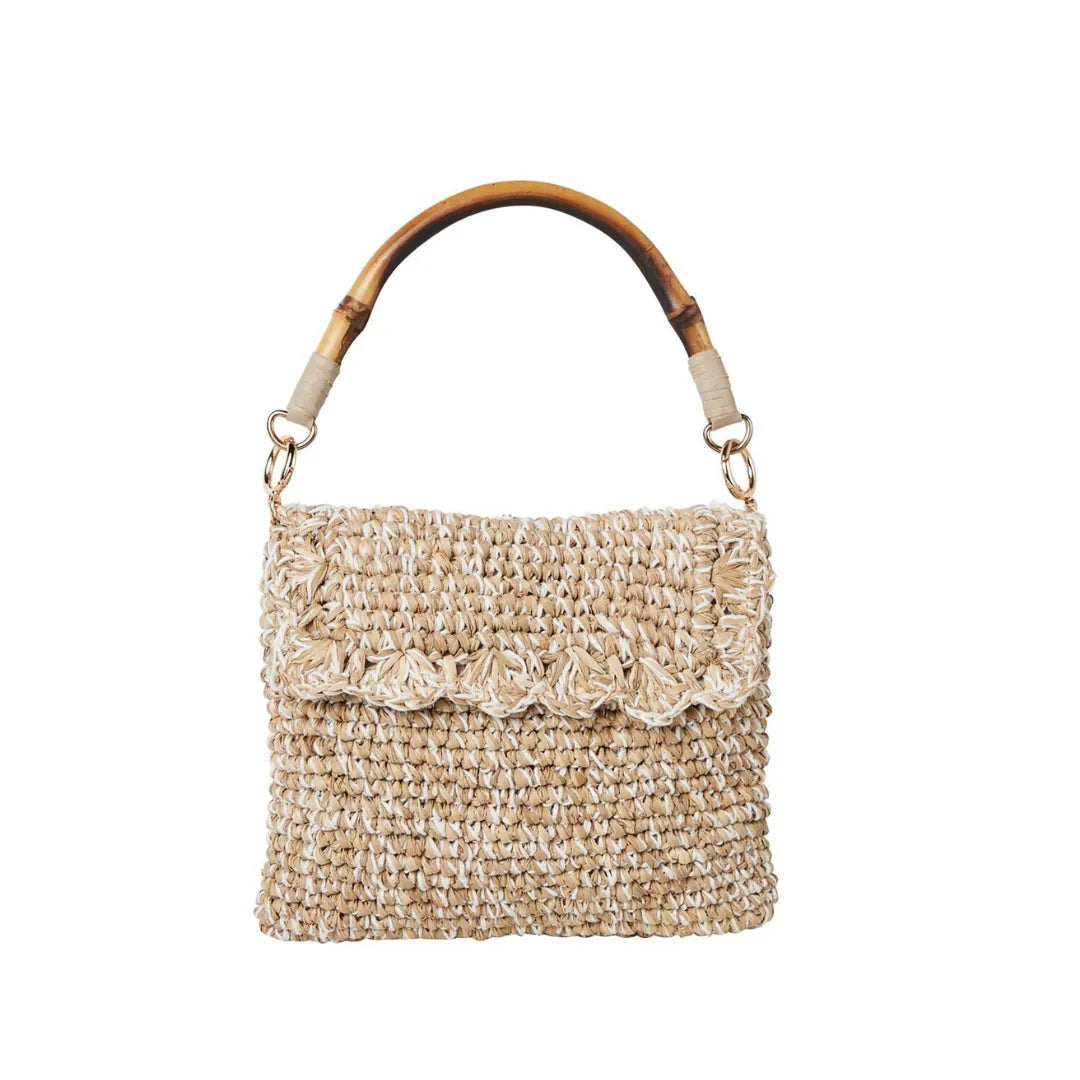Features: Raffia shoulder bag with inside pocket and 2 interchangeable handles: a bamboo handle & block-printed beaded strap.