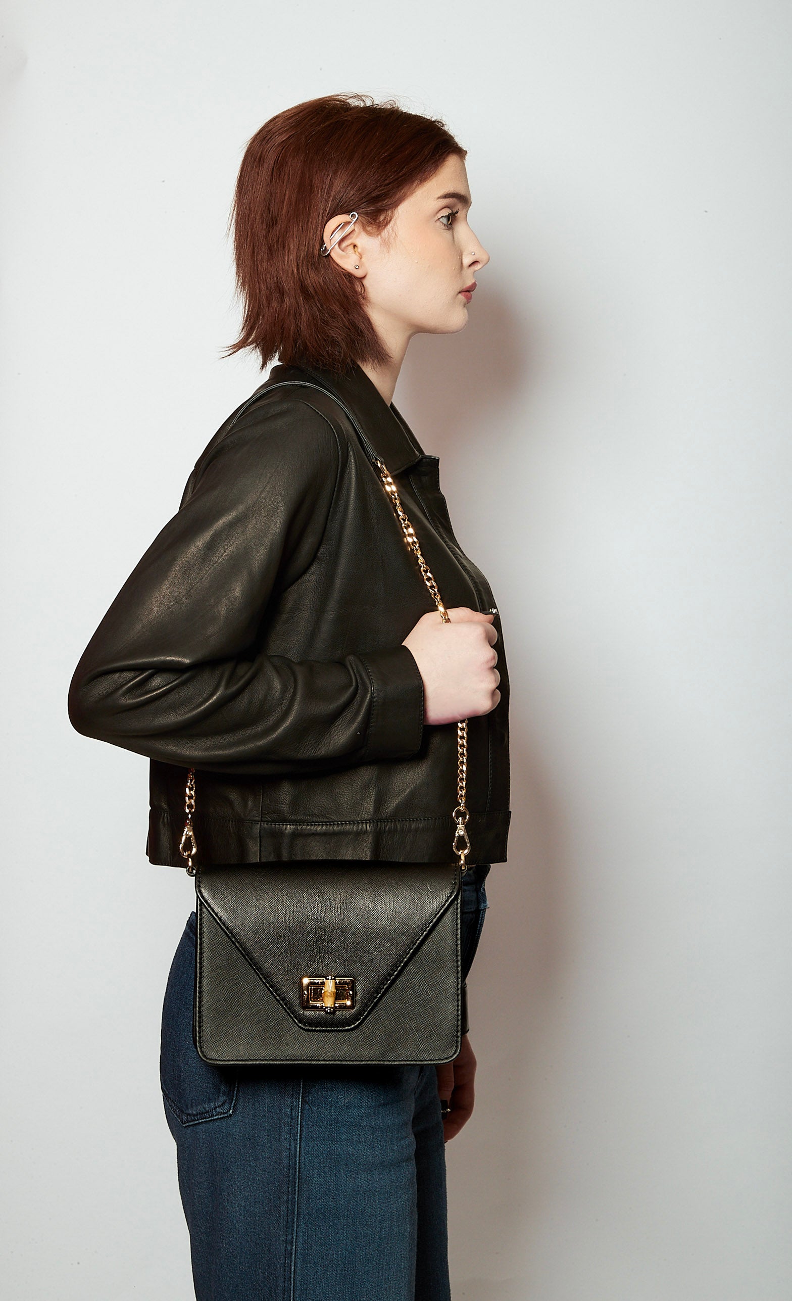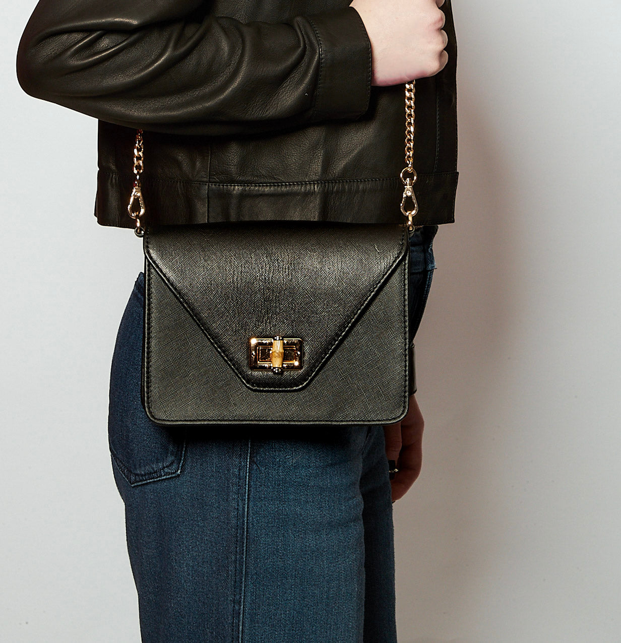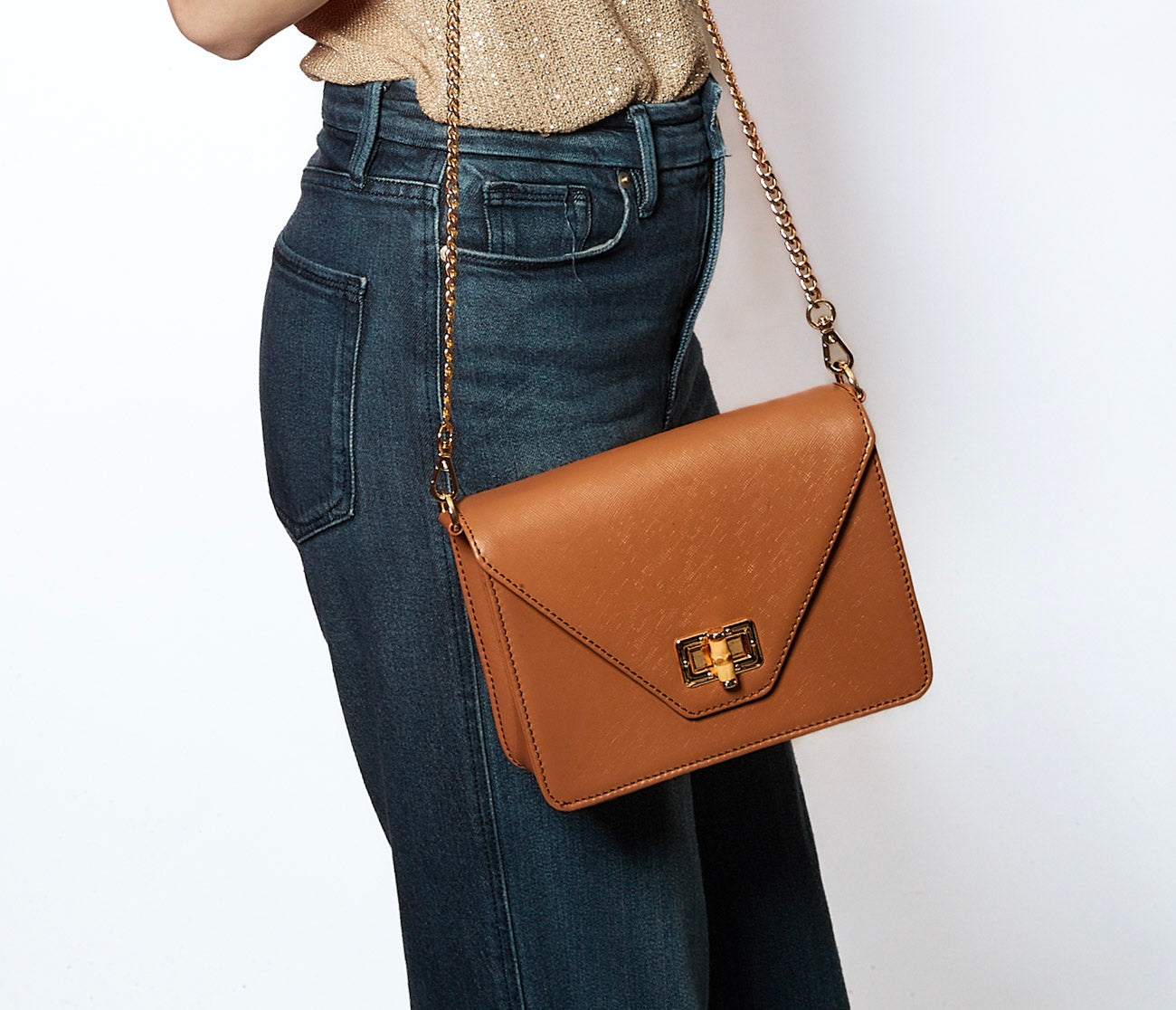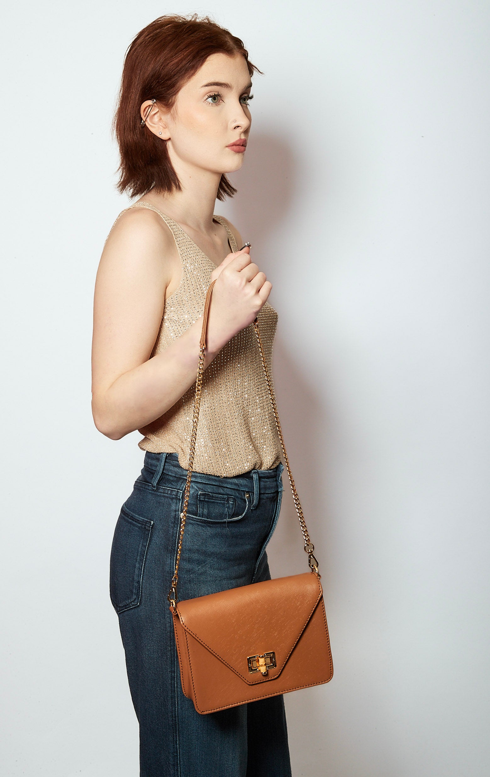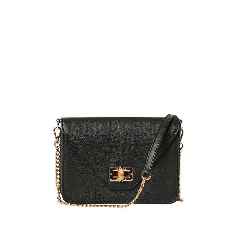 Features: Detachable crossbody chain with bamboo closure & Interior pocket.