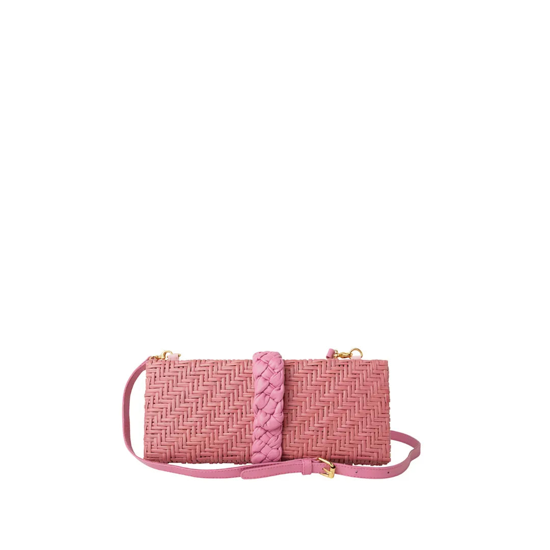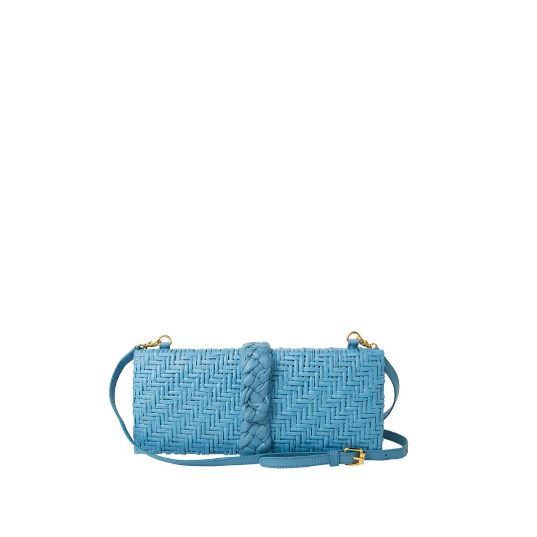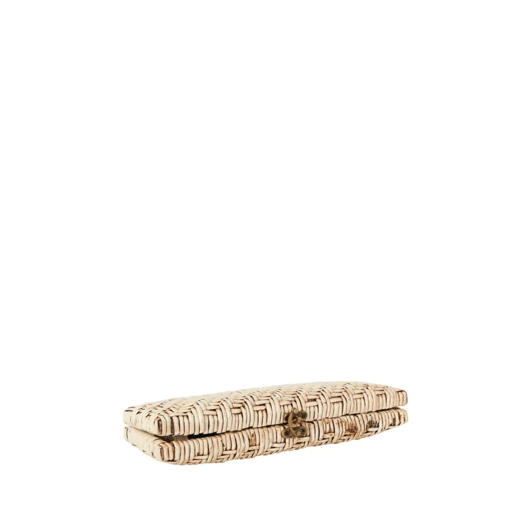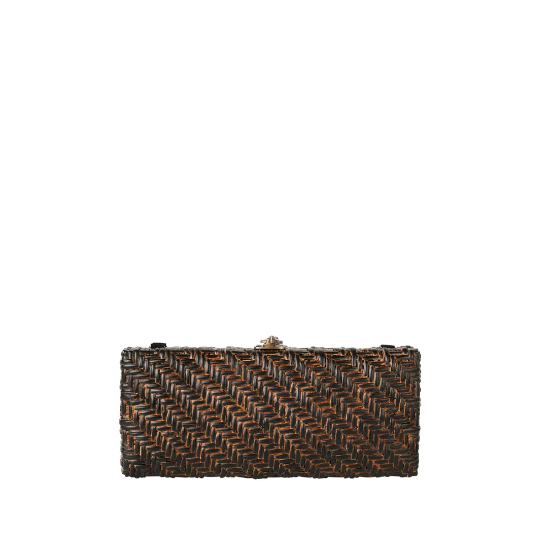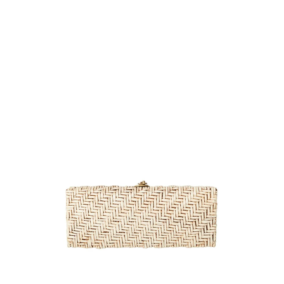 Paula, She’s a girl’s best clutch. Handmade luxury clutch woven from the skin of rattan and then gently handprinted and wrapped with a braided lambskin closure and crossbody strap. She hold all that you need for a day at lunch or a night on the town for the city or your perfection vacation. She holds an iPhone, cc card case, lipstick and keys! She is handmade with love and part of our woven and wicker Sarah Stewart Collection.